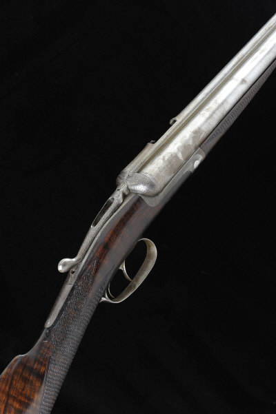JAMES MACNAUGHTON THE ACTION, STOCK AND FORE-END ONLY OF A SCARCE 16-BORE BAR-IN-WOOD EDINBURGH ACTION LEVER COCKING GUN, NO. 948 the rounded skeleton frame and extended top lever with fine scroll engraving within Celtic strapwork borders, the maker's name signed across the breech within a scrolling banner, skeleton top lever, clear viewing port, safety catch missing, 14-inch well figured stock with horn butt plate S2 |