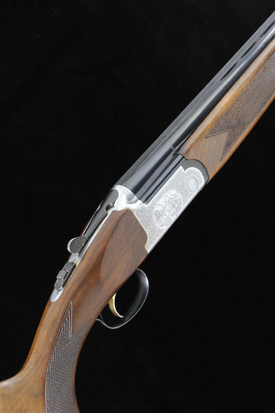 27 1/4-inch monobloc barrels with 3-inch chambers, with interchangeable choke tubes, machined ventilated rib, the frame with scroll decoration around scenes of dogs and game, selective single trigger, 14-inch figured stock with pistol grip, 7lb. 6oz., Italian nitro proof
