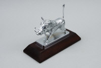 in the form of a warthog, chrome-plated, mounted on its wooden plinth