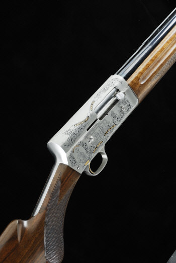 BROWNING A SCARCE 12-BORE "FINAL TRIBUTE" EDITION A5 SELF-LOADING SHOTGUN, NO. 243 OF 500 28-inch barrel with 2 3/4-inch chamber with interchangeable invector chokes, machined ventilated rib, the frame engraved with scrolls and scenes depicting J. M. Browning, his shop and the Herstal factory, scrolling banners incorporating gold commemorative text, reduced magazine capacity, 15-inch well figured stock with pistol grip and rubber recoil pad, 8lb. 8oz., Belgian nitro proof, in its maker's canvas case