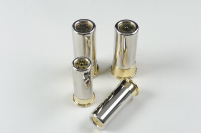 T. F. WOOD & SON TWO PAIRS OF NICKEL SALT AND PEPPER HOLDERS in the form of shotgun cartridges, 4-bore and 12-bore sizes, with brass cartridge heads |