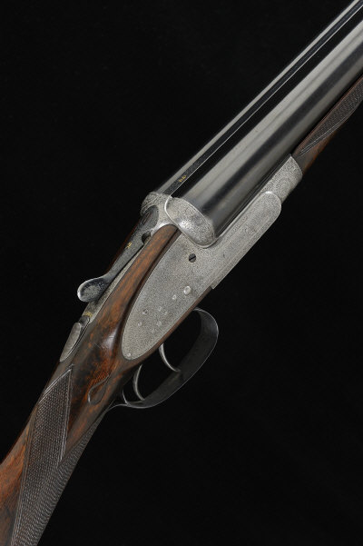 EDWINSON GREEN & SONS A 12-BORE SIDELOCK EJECTOR GUN, NO. 6353 28-inch barrels with 2 1/2-inch chambers, about improved cylinder choke borings, the frame, locks and gold numbered top lever with fine scroll engraving, 14 1/2-inch figured stock with ribbed butt plate, 6lb. 5oz., nitro proof, left barrel wall thickness below the recommended minimum, oak and leather case S2 |