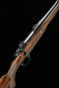 25-inch barrel threaded for a sound moderator, the receiver with blocks for swing-off mounts, bolt with side safety, magazine with hinged base plate, half length well figured stock with pistol grip, cheekpiece and recoil pad, recoil stud, 14 1/4-inch pull, sling eyes, 8lb. 5oz., nitro proof