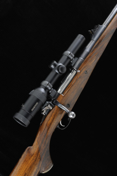T. T. PROCTOR A .458 LOTT BOLT-ACTION SPORTING RIFLE, NO. 132 26-inch barrel ported at the muzzle, ramp fore sight, rear sight with two folding leaves, the receiver mounted with a Swarovski Z6 1-6x24 EE telescopic sight in quick detachable mounts, bolt with side safety, recoil stud, the hinged magazine base plate with scroll engraving, the maker's name and calibre inlaid in gold, half length well figured stock with pistol grip, cheekpiece and rubber recoil pad, 15 1/2-inch pull, 10lb., nitro proof, in its leather and canvas rifle slip S1 The rifle was built in 2009 for the vendor and he states that he has used it to good effect in Africa. A quantity of ammunition is also available for this lot by negotiation. |