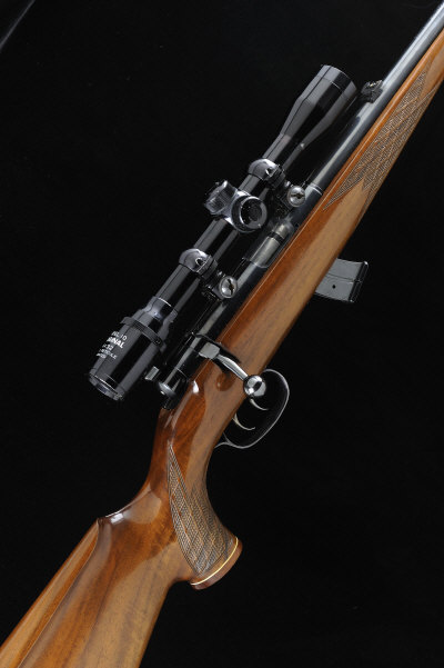 ANSCHUTZ A .22 MODEL 1422 BOLT-ACTION SPORTING RIFLE, NO. 1257547 24-inch barrel threaded for a sound moderator, with ramp fore sight and folding leaf sight, the receiver mounted with a 4x32 telescopic sight, bolt with flag safety, detachable box magazine, double set triggers, the half length figured stock with pistol grip, cheekpiece and maker's butt plate, 14 1/4-inch pull, sling swivels, 8lb. 4oz., German nitro proof S1 |
