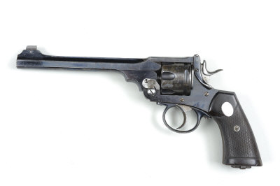 WILKINSON A SCARCE .450/.455 WILKINSON TARGET REVOLVER, NO. 128810 (3985) 7 1/2-inch barrel, the top surface impressed 'Wilkinson Gunmakers, Pall Mall, London SW', the frame with stirrup catch, adjustable rear sight and winged bullet trademark, chequered back strap, chequered walnut grips with silver oval, chipped, lanyard loop, retaining some original finish overall, black powder proof S5 |