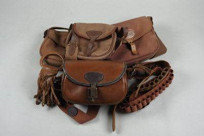 A LEATHER CARTRIDGE BAG together with three further canvas cartridge bags; two cartridge belts; and a game carrier (7) |