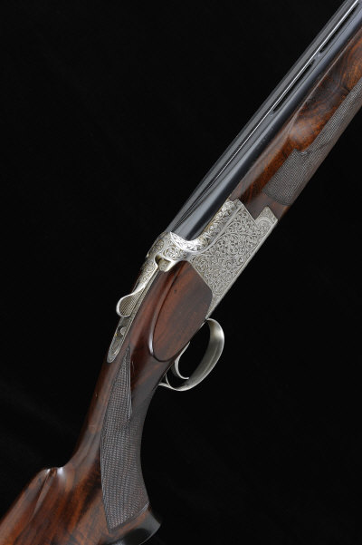 BROWNING A 12-BORE CUSTOM SHOP BUILT SINGLE TRIGGER OVER AND UNDER EJECTOR GUN, NO. 893RR1001 30-inch barrels with 2 3/4-inch chambers, about 3/8 and full choke borings, machined ventilated rib with tapered top surface, mid bead, the frame and top lever with bold foliate scroll engraving, 14 1/2-inch highly figured stock with pistol grip, grip cap and rubber recoil pad, 8lb. 2oz., Belgian nitro proof, in its maker's case S2 The gun was custom built for a member of the England Trap Shooting team for use in Olympic Trap, ISU 5 Trap and ISU Ball Trap events. Customised features included: weight and balance point; broad tapered rib; interchangeable fore sight elements; choke borings and trigger pulls; stock dimensions including hand positioning, forward lip and tuned recoil pad Hysteresis. It achieved many class wins including the Rolex British Olympic Trap Grand Prix. |