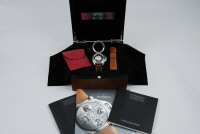 the 44mm diameter steel case with hinged cover engraved with a scene of woodcock against a woodland background, surrounded by foliate scrollwork, automatic mechanical movement, contained in its maker's presentation box, with additional ungraved cover, spare strap, certificates and guarantees dated 2007