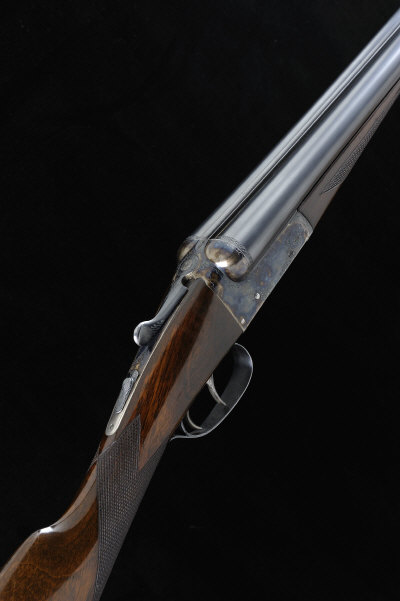 AYA A 12-BORE NO.4 MODEL BOXLOCK EJECTOR GUN, NO. 172949 28-inch chopper-lump barrels with 2 3/4-inch chambers, about 1/2 and full choke borings, the frame and top lever with scroll engraving and retaining much original hardening colour, 14 3/4-inch figured stock, 6lb. 7oz., Spanish nitro proof |