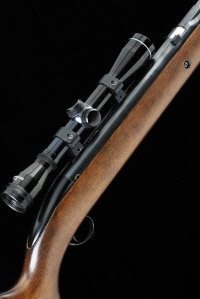 18 1/2-inch barrel with rotary breech, mounted with a Bushmaster 4x32 telescopic sight, half length stock with pistol grip, cheekpiece and recoil pad, 13 1/2-inch pull, 8lb. 6oz.