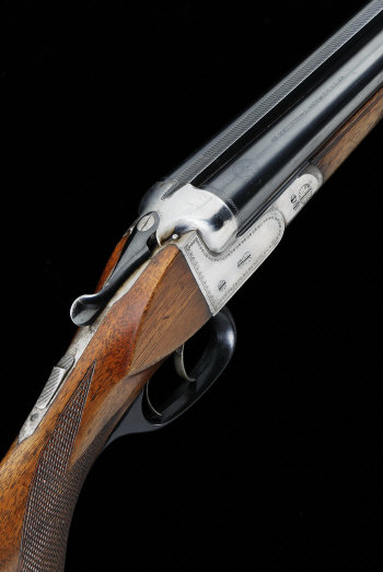 A GERMAN 16-BORE BOXLOCK NON-EJECTOR GUN, NO. 330402 28-inch barrels with 2 1/2-inch chambers about 1/2 choke borings, proof marks for May 1940, machined rib with crossbolt extension, the frame with border engraving and retaining traces of original hardening colour, cocking studs, composition trigger guard, 14 1/4-inch stock with semi pistol grip, 6lb., nitro re-proof |