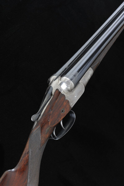 28-inch sleeved barrels with 2 1/2-inch chambers, about 1/4 and 1/2 choke borings, crossbolt extension, the rib engraved with the London and Birmingham address and dates for the London Gun Trials to 1879, the scroll-backed frame and top lever with fine scroll engraving around scenes of dogs and game, the breeches with further engraving, non-automatic side safety, 14 1/2-inch figured stock including 2-inch ebonite recoil pad extension, 7lb. 6oz., nitro proof