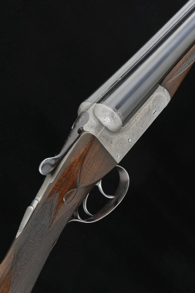 C. HELLIS & SON LTD A 12-BORE BOXLOCK EJECTOR GUN, NO. 3817 28-inch sleeved barrels with 2 3/4-inch chambers, about improved cylinder and 1/4 choke borings, top extension, the frame and top lever with bouquet and scroll engraving, 15 1/2-inch figured stock, 6lb. 8oz., nitro proof, re-jointing recommended, in its leather case S2 |