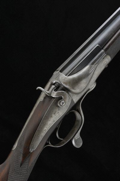 39 1/4-inch barrel with 4 1/4-inch chamber, about full choke boring, machined solid tapered rib, the rounded clam-shell bolstered frame, rebounding backlock, hammer and rotary underlever with border engraving, retaining traces of original hardening colour, 12 3/4-inch stock including 1/4-inch extension and slip-on recoil pad, 11lb. 10oz., German black powder proof