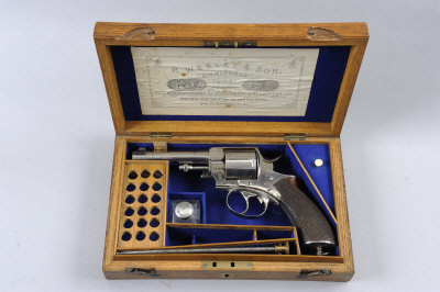 P. WEBLEY & SON A SCARCE .450 NO.1 R.I.C. REVOLVER, NO. 4178 4 1/2-inch barrel, flat top surface, the solid frame with winged bullet trademark, the top surface impressed with retailer's name, Army & Navy C.S.L., retaining much of its nickel plated finish overall, loading gate and swing-out ejector rod, one piece walnut grip with lanyard, black powder proof, in its maker's oak case with oil bottle, etc