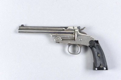 SMITH & WESSON A .22 MODEL OF 91 SINGLE SHOT TARGET PISTOL, NO. 22853 6-inch barrel with patent dates to 1880, the nickel plated frame with trademark and retaining virtually all of its original finish, chequered composition grips, special definitive proof S5 This lot will not be available for viewing in London. It can be viewed by appointment at our office in West Sussex. |