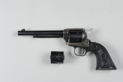 COLT A .22 MAGNUM "PEACEMAKER .22" MODEL SINGLE ACTION REVOLVER, NO. G160603 6-inch barrel with ejector rod, interchangeable .22 LR cylinder, the solid frame with patent dates and rampant colt motif, retaining much original finish overall, chequered composition grips, nitro proof S5 |