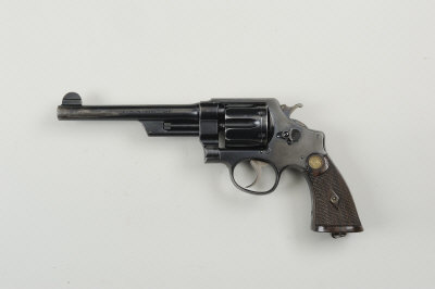 SMITH & WESSON A .455 "TRIPLE LOCK" FIRST MODEL HAND EJECTOR REVOLVER, NO. 12646 6 1/2-inch barrel with ejector shroud, the plain frame with sighting groove and swing-out cylinder, retaining much original finish overall, Enfield inspector's mark, chequered walnut grips and lanyard loop, nitro proof S5 The revolver is sold with a copy of a Roy Jilks factory letter stating that the revolver was shipped December 16th, 1916 and delivered to Figaro & Co. |