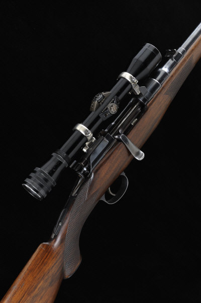 22 1/2-inch barrel with ramp fore sight, rear sight with folding leaves, the receiver mounted with a B-Nickel Marburg telescopic sight, bolt with flag safety, rotary magazine, tang with peep sight, the half length figured stock with pistol grip, cheekpiece and ribbed steel butt plate, 14 1/2-inch pull, 8lb., nitro proof