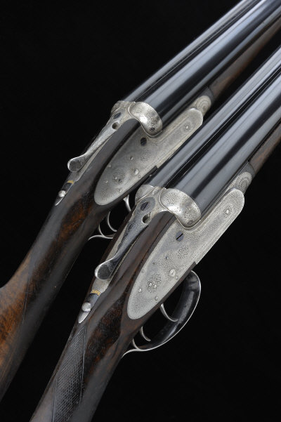 J. PURDEY & SONS A PAIR OF 12-BORE SELF-OPENING SIDELOCK EJECTOR GUNS, NOS. 17334/5 28-inch chopper-lump barrels with 2 1/2-inch chambers, about 1/4 and 1/2 choke borings, the frames, locks and numbered top lever with fine bouquet and scroll engraving and retaining traces of original hardening colour, the additional 28-inch chopper-lump barrels by another with 2 1/2-inch chambers, about 1/4 and 1/2 choke borings, 15 1/2-inch highly figured stocks including rubber recoil pads, 6lb. 10oz., nitro proof, in their maker's lightweight leather motor case with canvas outer cover S2 The maker confirms that the guns were built in 1901. The guns were re-proofed and re-barrelled in the London trade in 1987. |