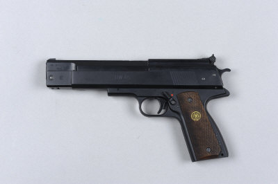 8-inch barrel, the top surface with dove-tail grooves and adjustable rear sight, chequered grips