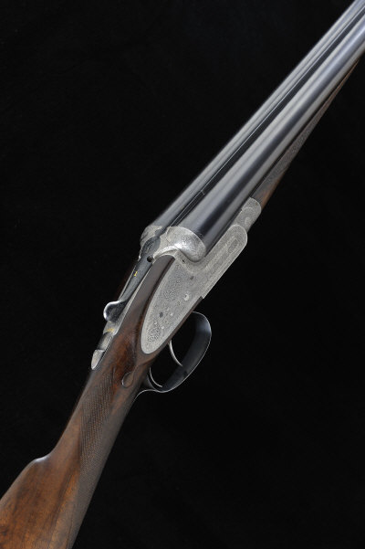 WILLIAM POWELL & SON A 12-BORE SIDELOCK EJECTOR GUN, NO. 11722 29 1/4-inch barrels with 2 1/2-inch chambers, about improved cylinder and 1/4 choke borings, doll's head extension, the frame, locks and gold numbered top lever with fine bouquet and scroll engraving, 15-inch well figured stock including 1-inch extension, 6lb. 10oz., nitro proof, left bore dented and barrel wall thickness below the recommended minimum, top lever spring broken S2 |