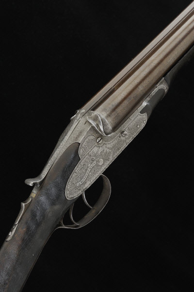 T. HORSLEY & SON A SCARCE PATENT 12-BORE SIDELOCK NON-EJECTOR GUN, NO. 2906 30-inch damascus barrels with 2 3/4-inch chambers, about improved cylinder choke borings, doll's head extension, the bar-in-wood frame, locks and patent sliding top lever with foliate scroll engraving, the maker's name signed within a banner, 14-inch figured stock variously cracked and worn with pieces missing beneath each lock plate, leather butt plate with parts missing, 6lb. 13oz., black powder proof, worn overall, bores pitted S2 The gun is a rare example of Charles Horsley and Charles Pryse's patent no. 3874 of 1883. The patent has much in common with Beesley's famous patent no. 31 of 1880 and features a double-limbed mainspring that is compressed upon closing the gun. |