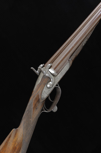 CHARLES OSBORNE A 12-BORE BAR-IN-WOOD PINFIRE GUN 29 3/4-inch damascus barrels with 2 1/2-inch chambers, about true cylinder borings, the frame, non-rebounding barlocks, hammers and rotary underlever with scroll engraving, the maker's name signed within a scrolling banner, retaining faint traces of original hardening colour, non-detachable fore-end, 14 1/4-inch well figured stock, 6lb. 10oz., black powder proof (1868 Rules), bores pitted S58 |
