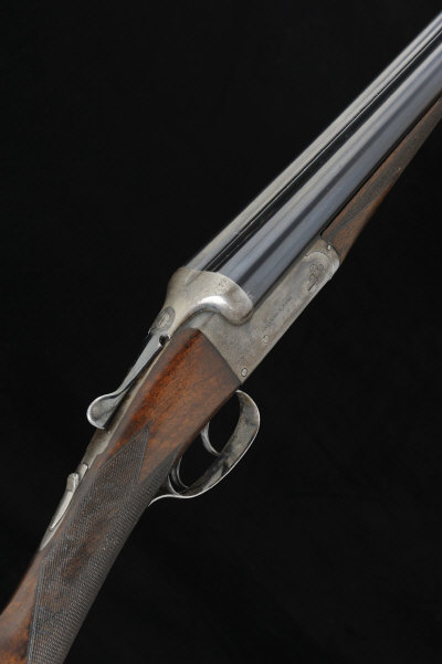 28-inch barrels with 2 1/2-inch chambers, about improved cylinder and full choke borings, the plain frame and top lever with floral decoration and retaining traces of original hardening colour, 14 1/2-inch figured stock, 5lb. 12oz., nitro re-proof