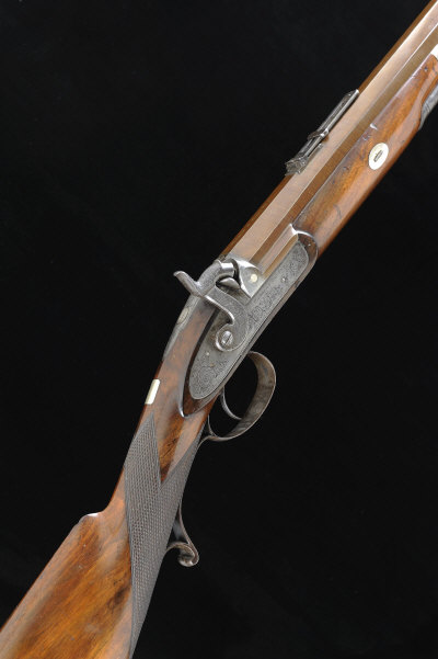 CHARLES NEPHEW & CO. AN 8-BORE PERCUSSION SPORTING RIFLE 32 1/2-inch octagonal damascus twist barrel with folding ladder sight, engraved breech with platinum plug, the lock and hammer with scroll engraving, full length ramrod, set trigger, the half length stock with steel butt plate, 14-inch pull, sling eyes, 10lb. 6oz., black powder proof S58 |