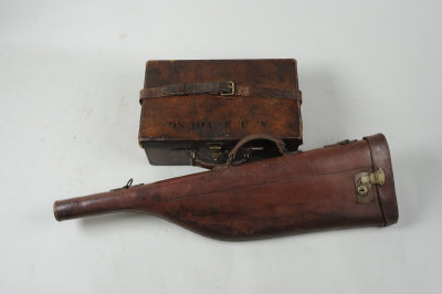 for about 250 cases, with straps and dividers; together with a leather leg-of-mutton gun case (2)