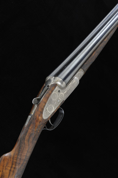 ARTHUR ILSLEY A 12-BORE SELF-OPENING SINGLE TRIGGER SIDELOCK EJECTOR GUN, NO. 7038 25-inch chopper-lump barrels with 2 1/2-inch chambers, about 1/4 and 1/2 choke borings, the frame, locks and top lever with bouquet and scroll engraving, rolled edge trigger guard, 13 1/2-inch highly figured replacement stock and fore-end wood, 6lb. 3oz., nitro proof, leather case S2 |