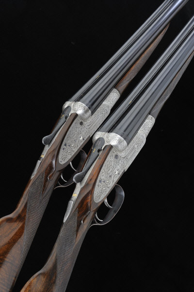 ALEX MARTIN A PAIR OF 16-BORE SIDELOCK EJECTOR GUNS, NOS. 6226/7 28-inch chopper-lump sleeved barrels with 2 3/4-inch chambers, about 1/2 and 3/4 choke borings, mid extensions, the frames, locks and gold numbered top levers engraved with Celtic strapwork, the maker's name signed within a panel, No.1 gun with 14 1/2-inch highly figured stock including ebonite butt plate, No.2 gun with 14 1/2-inch well figured replacement stock, 6lb. 2oz., nitro proof, oak case S2 |
