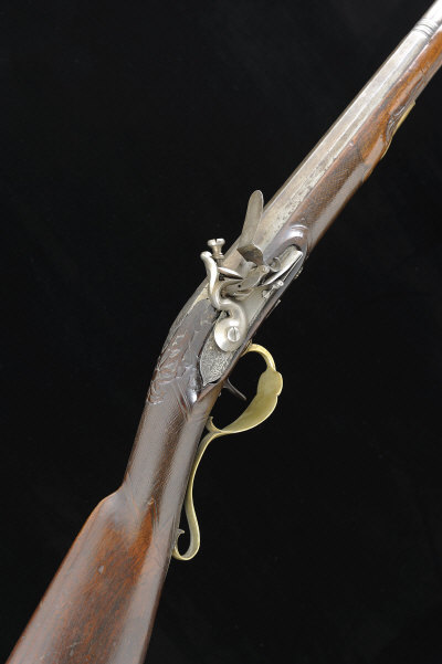 31 1/2-inch two-stage octagonal to round barrel, the lock with border engraving, the full length stock with ramrod and brass furniture, cheekpiece, 13 1/2-inch pull, 5lb. 9oz.