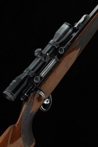 SAKO A .243 BOLT-ACTION SPORTING RIFLE, NO. 105593 23-inch barrel with ramp fore sight and adjustable rear sight, the receiver mounted with a Swarovski Habicht 4 telescopic sight, bolt with side safety, magazine with hinged base plate, the half length stock with pistol grip and cheekpiece, folding bipod, 14-inch pull, 9lb. 12oz., nitro proof |