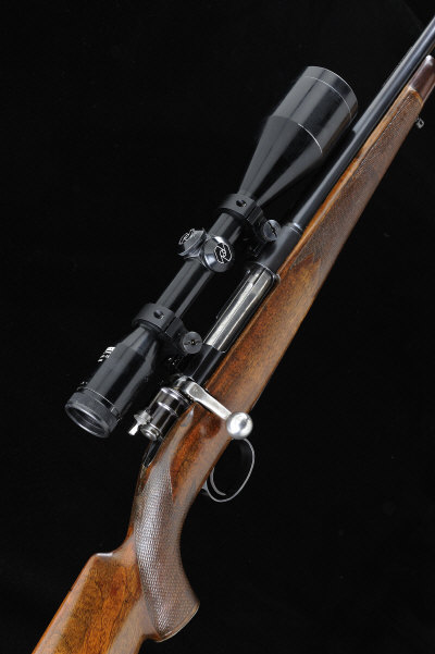 24-inch barrel with ramp fore sight, the receiver mounted with a Zeiss Diatal-ZA 8x56 telescopic sight, magazine with detachable floor plate, half length stock with pistol grip, cheekpiece and recoil pad, 13 1/2-inch pull, 8lb. 8oz., nitro proof