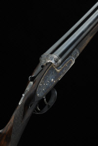 GUNMARK A 12-BORE "BLACK SABEL DELUXE" MODEL SIDELOCK EJECTOR GUN, NO. PG74343 27-inch barrels with 2 3/4-inch chambers about improved cylinder and 1/2 choke borings, the frame, hand detachable locks and top lever with scroll engraving and retaining much original hardening colour, 14 1/2-inch figured stock including rubber recoil pad, 6lb. 9oz., Spanish nitro proof |
