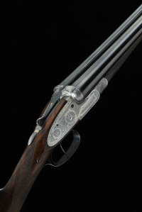 30-inch barrels with 2 3/4-inch chambers about improved cylinder and full choke borings, doll's head extension, the frame, back action bar locks and gold numbered top lever with bouquet and scroll engraving and retaining traces of original hardening colour, fluted fences, 14 1/2-inch well figured stock including 1-inch extension, 6lb. 7oz., nitro proof, bores marked