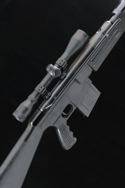 SUSSEX ARMOURY A .22 "JACKAL" SIDE LEVER AIR RIFLE, NO. 0417 8-inch barrel with muzzle shroud, the receiver mounted with a telescopic sight, side lever and loading tap, black synthetic stock with pistol grip and dummy magazine, 14 1/2-inch pull, 7lb. 14oz. |