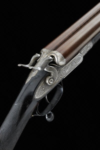BURROWS A 10-BORE HAMMER GUN, NO. 550 30-inch damascus barrels, the frame, rebounding bar locks, hammers and rotary under lever with fine scroll engraving and retaining traces of original hardening colour, the maker's name signed within a scrolling banner, 14 3/4-inch well-figured stock with engraved steel and toe plates, 7lb. 12oz., black powder proof |