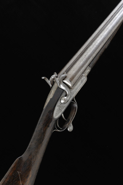 J. VENABLES & SON A 12-BORE PINFIRE HAMMER GUN 29 1/2-inch barrels with 2 1/2-inch chambers, about true cylinder borings, the frame, non-rebounding bar locks, hammers and rotary underlever with fine scroll engraving and retaining some original hardening colour, 14 1/4-inch figured stock with steel butt plate, the large silver escutcheon engraved "British Isles, Corfu, Albania, North Africa, Canada, United States, Newfoundland", 6lb. 11oz., black powder proof S58 |