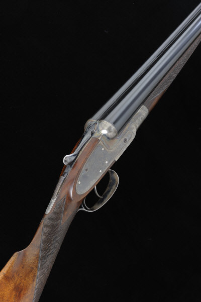 30-inch Vickers steel barrels with 2 1/2-inch chambers, about 1/4 and 3/4 choke borings, the frame, locks and top lever with border engraving and retaining much original hardening colour, 14 1/4-inch well figured stock with ribbed butt plate, 6lb. 4oz., nitro proof, in its canvas case