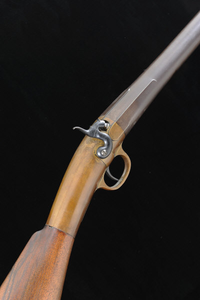 24-inch damascus barrel, the heavy brass breech and trigger guard with plain steel hammer, the stock with rubber recoil pad, 14 1/4-inch pull, 12lb. 8oz., black powder proof, together with two harpoons