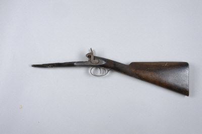 WESTLEY RICHARDS THE STOCK AND ACTION ONLY OF PERCUSSION DOUBLE BARREL SPORTING GUN the locks, hammers and breech with scroll engraving, the half length stock with steel butt plate, 13 3/4-inch pull, barrels missing, worn overall S58 |