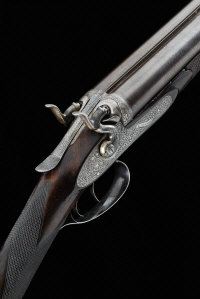 30-inch barrels with 2 1/2-inch chambers, about true cylinder borings, the frame, non-rebounding bar locks, hammers and sliding top lever profusely engraved with scrollwork within patterned borders and retaining faint traces of hardening colour, the maker's name signed within a scrolling banner, 14 1/4-inch well figured stock, 7lb. 4oz., black powder proof, bores pitted