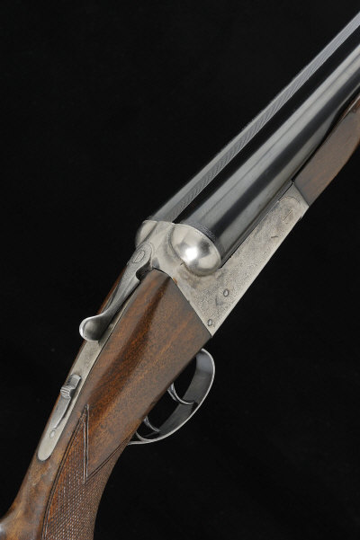 32-inch barrels with 3 1/2-inch chambers, about 3/4 choke borings, machined solid rib, the frame and top lever with scroll decoration and retaining some original hardening colour, 14 3/4-inch figured stock with pistol grip and rubber recoil pad, beaver tail fore-end, 10lb., nitro re-proof