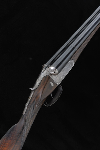28-inch barrels sleeved by Westley Richards, with 2 3/4-inch chambers about 1/2 and full choke borings, doll's head extension, the frame and patent lift-up top lever with border and scroll engraving, 14-inch well figured stock with ribbed butt plate, 6lb. 12oz., nitro proof