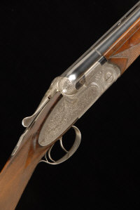 28-inch monoblock barrels with 2 3/4-inch chambers, about 1/4 and full choke borings, machined ventilated rib, crossbolt extensions, the frame and locks with foliate scroll engraving, spring bladed front trigger, 14-inch figured stock including leather covered recoil pad, Italian nitro proof, 7lb.