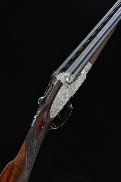30-inch barrels with 2 1/2-inch chambers, about 1/4 and 1/2 choke borings, top extension, the frame, locks and numbered top lever with fine scroll engraving, 15-inch well figured stock including rubber recoil pad, 6lb. 10oz., nitro re-proof, barrel wall thickness below the recommended minimum